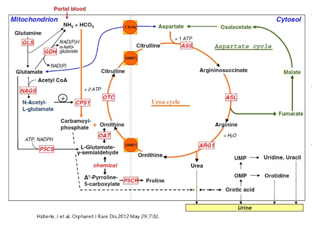 其中,前 3 种酶位于线粒体内,后 3 种位于胞浆内。为了让整个循环顺利运转,还需要两种重要的转运体协助底物跨越线粒体内膜:citrin 负责将天冬氨酸转运至胞浆,ORNT1 则将鸟氨酸送入线粒体。
