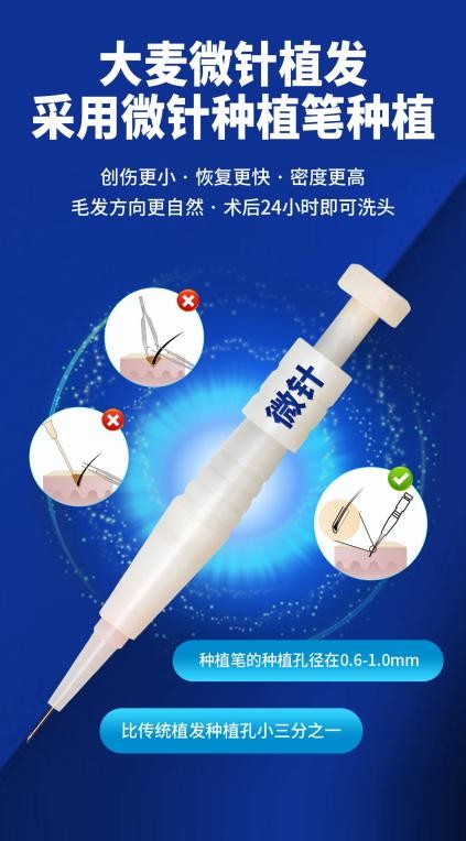 大麦微针植发采用微针种植笔进行种植,直径仅 0.6-1.0 毫米,创口仅为传统植发的 1/3,打孔与种植同步完成,出血量极少,术后 24 小时即可洗头,,不影响正常工作和生活;此外种植笔可 360° 旋转,精准模拟头发生长方向,避免传统植发 “方向杂乱、密度不均” 的问题,种植密度更高,新发生长后与原生发无缝衔接,肉眼看不出种植痕迹。